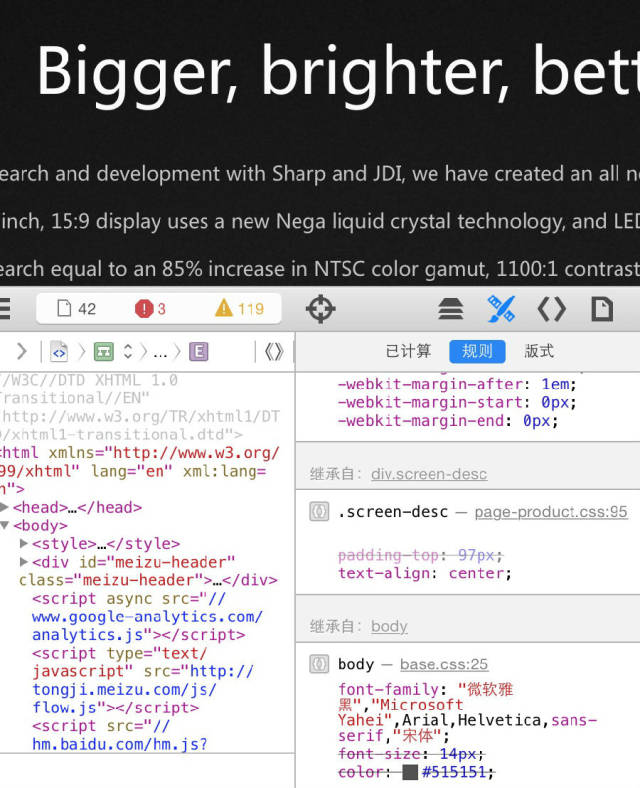 这“字体列表”的写法让人震惊,魅族的网页设计师对英文字体可谓全无造诣。而在“类字体”之后再添加一个“宋体”的做法也是让人瞠目结舌。