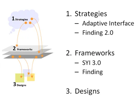 你可以从中看到自己的影响力到哪,一个设计师如果是精于designs,那你是个很好的设计助理,如果能能对frameworks提出成熟方案,那应该是个很合格的交互设计师了,如果你对strategies有影响,甚至有一定决策权,那恭喜你,你理所当然应该得到所有HCIer的尊重。