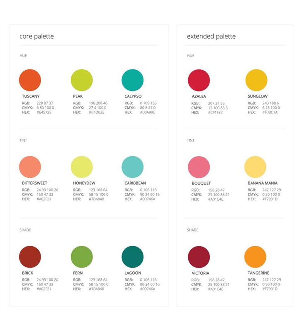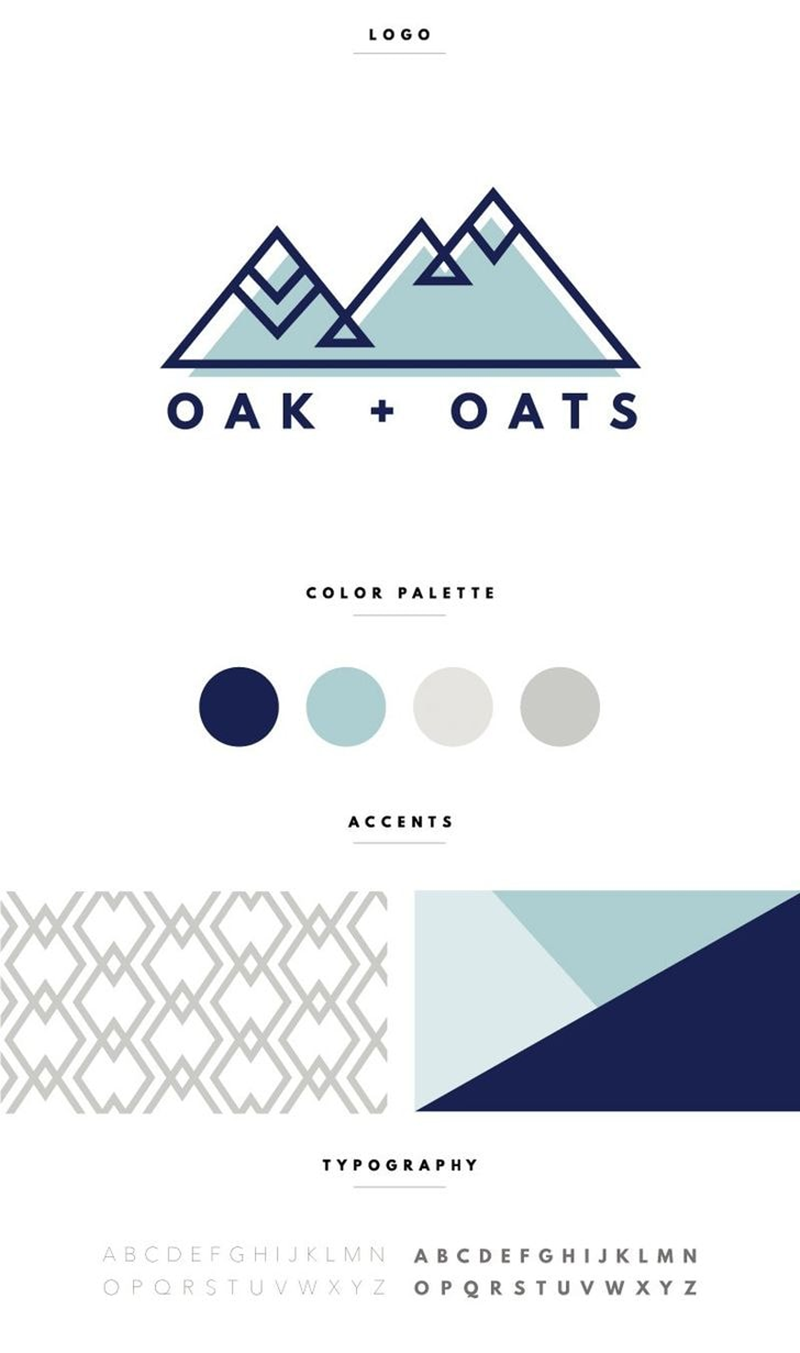 正如你通过此图像底部的彩色条纹所看到的那样,设计师为此品牌项目选择了三种互补的色彩/色度(蓝色、绿色和灰色)。她通过将每组颜色限制为两种颜色,一种色彩和一种色度,使调色板不会失控。