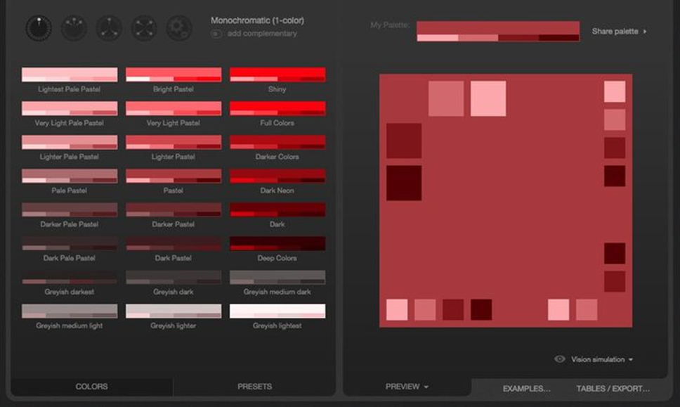 仅仅用肉眼就很难选择色彩和色度。有些设计程序会有适合您的工具,但这些工具可能会受到限制或无法自定义。然而,有很多在线工具可以帮助你,让我们来看看一些最好的。Paletton的单色设置会自动从基色中生成调色板和色调——可以从色轮中随意选择,或者RGB代码中输入一个特定的颜色。