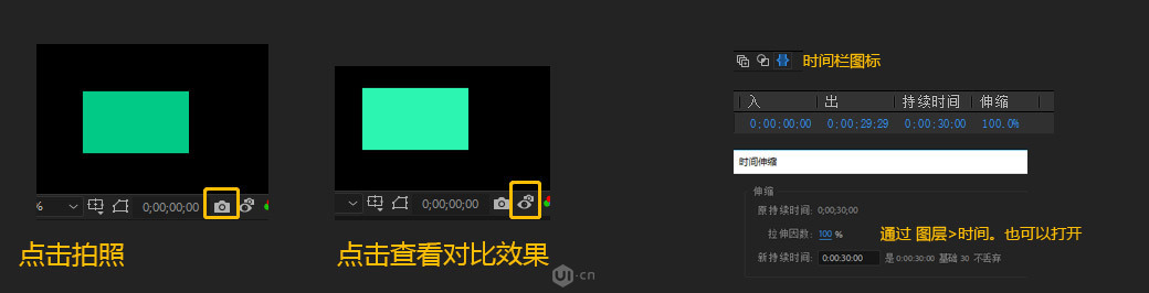 第一个摄像机按钮是对屏幕拍照,第二个图标是调整后的对比查看,和第一个按钮配合使用。时间栏图标可以直接打开时间伸缩,调整视频快慢。