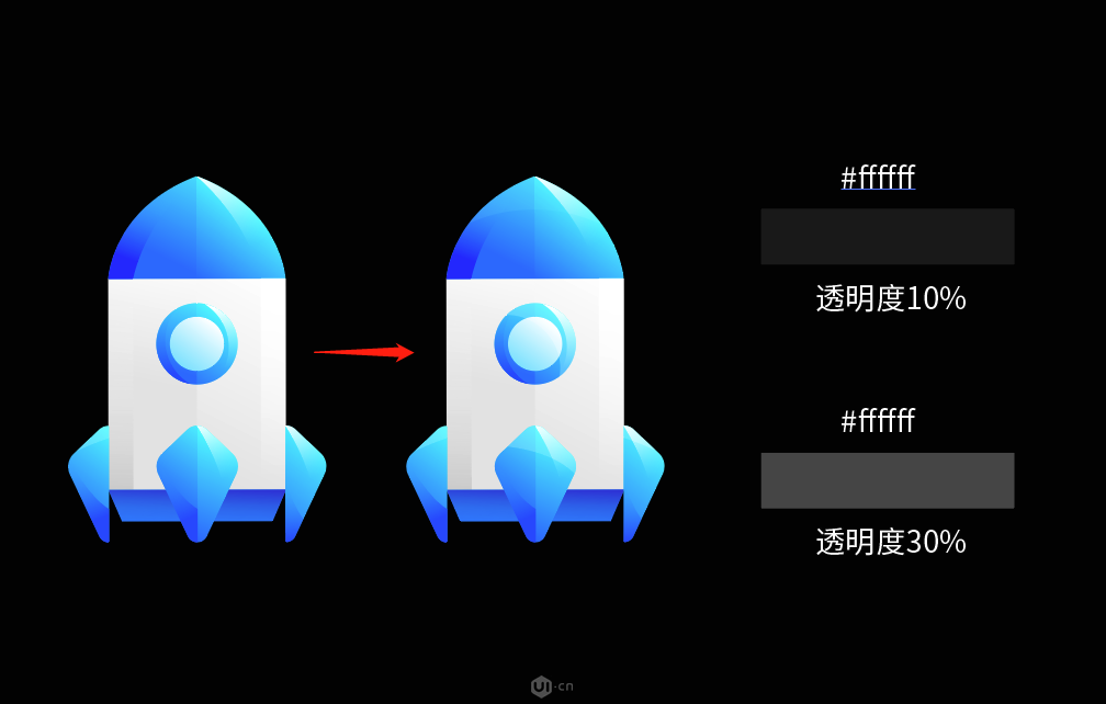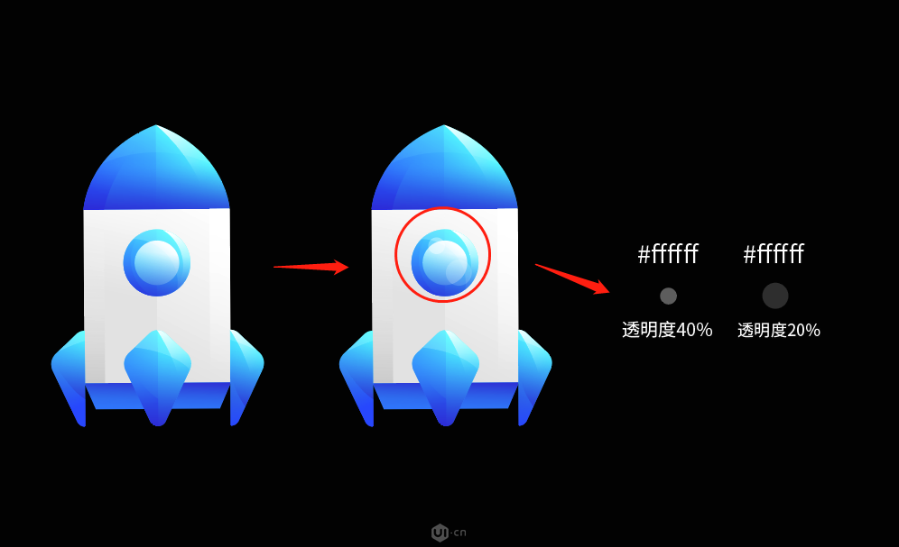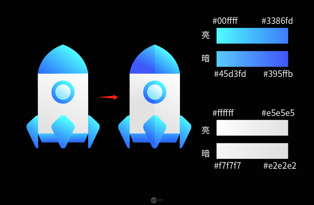 根据上面所总结的规律,我们先给小火箭划分暗面与亮面(亮面与暗面需要根据实际去思考要不要添加),小伙伴们可以根据胖虎分享的一套图标可以去看下哪些有加,哪些没加。