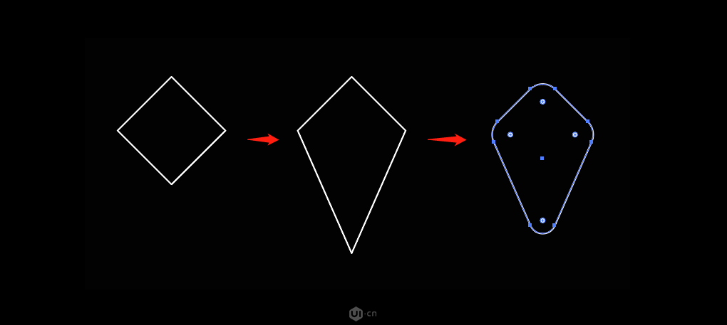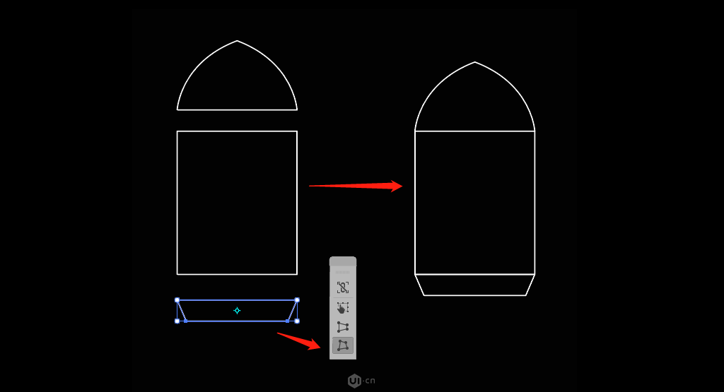 我们先画中间的尾翼,先画一个矩形,然后用直接选择工具(A) 选中最底部的一个锚点往下拉,然后将4个角拉成合适大小的圆角,如下图所示:
