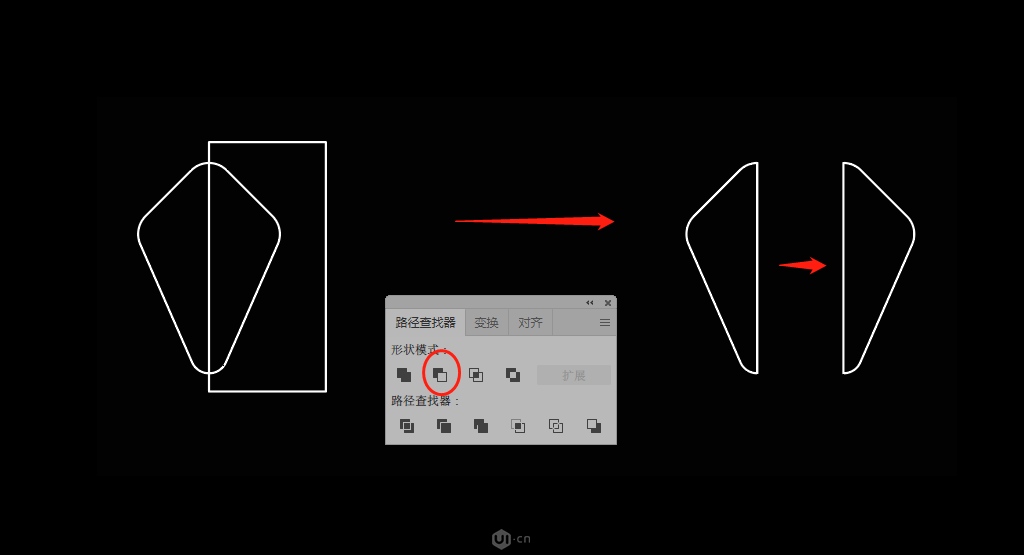 先复制一个完整的尾翼出来,画一个矩形,然后减去顶层图形,得到一个侧面的尾翼。接着我们点击侧面尾翼进行:右键>对称>变换>对称>垂直对称,选择复制,就会得到另外一个侧面尾翼,如下图所示: