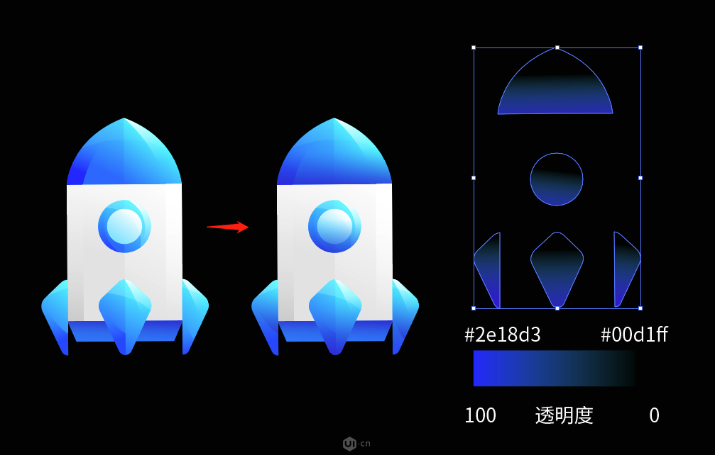 如下图所示,根据光源的右上角位置,给小火箭每个部位上基本的渐变色,因为光源在右上角,所以从右上到左下的颜色规律是从亮到暗。