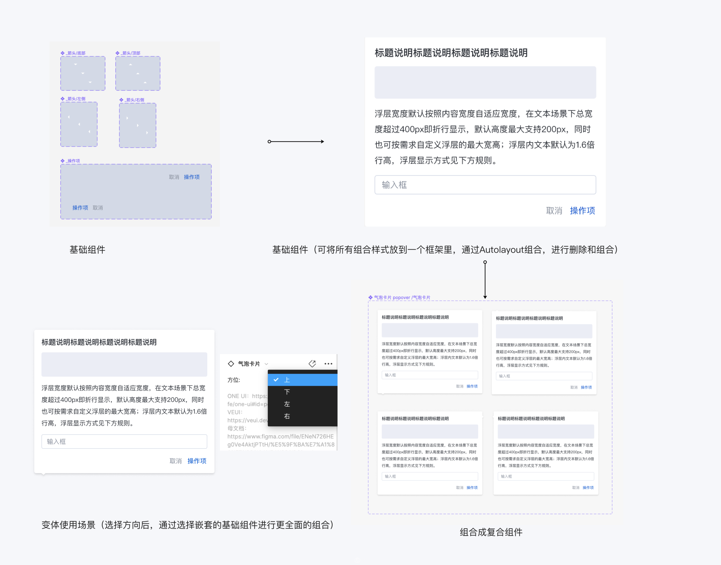 Figma的变体功能很强大,可以进行很多样式的排列组合。但是我们也发现在创建变体的时候,如果按照每个状态、种类进行划分的时候,整个组件会非常的繁杂臃肿。比如Popover,会发现在创建它的各种状态时会非常麻烦,除了箭头在各个方向的位置外,还要考虑里面元素的组合,比如纯文本、标题+文本、标题+图文、文本+按钮等等,这样组合起来的组件会非常的臃肿,也不利于设计师去选择。所以我们要学会层级的梳理,比如可以将箭头、按钮、标题图文进行一个分布组合,然后再将这些组合成一个新的组件,通过嵌套的层级关系去调整每个层级的位置关系或者剔除某些不需要的层级。