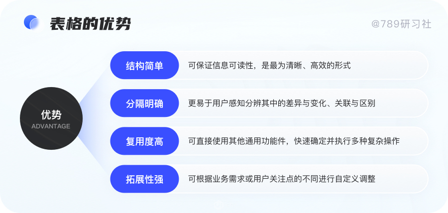 表格适合信息的归纳与分类,数据经过归纳整理和合理布局后,更易于用户在信息之间进行对比,快速定位、查询其中的差异与变化、关联和区别。