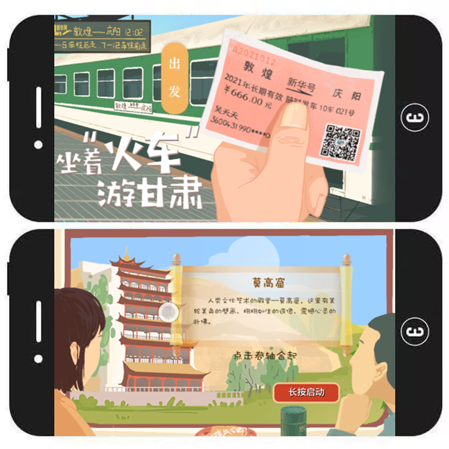 内容简介:该H5旨在向用户介绍甘肃的知名地标、美食、文化等。作品主界面以插画的方式营造出了一个坐在火车内观赏窗外美景的场景。用户可通过长按提示按钮的方式触发横长图匀速播放,还可点击长图中闪动的白色按钮,以查看相关详细介绍。
