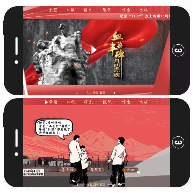 内容简介:该H5旨在纪念“11·27”烈士殉难75周年。作品主要包含觉醒、入秋、曙光、绝笔、惊雷、忠魂这6个部分,用户可通过滑屏、点击操作查看一系列图文及视频内容,从而了解相关烈士事迹、革命故事。另外,用户还可在浏览过程中根据提示参与一些趣味互动,包括在线答题、通过擦除操作查看如今的垫江美景。