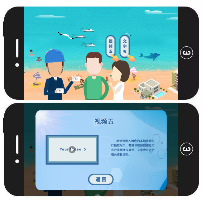 模板简介:该H5模板主要以时间轴的方式增添画面的层次感和立体感,并为“海豚”元素注入灵动与活力。全篇以“海豚遨游海洋”贯穿始终,并将灯塔、船只、人物等元素穿插其中。用户可在横屏滑动浏览过程中点击提示按钮,以查看各种视频及图文内容。