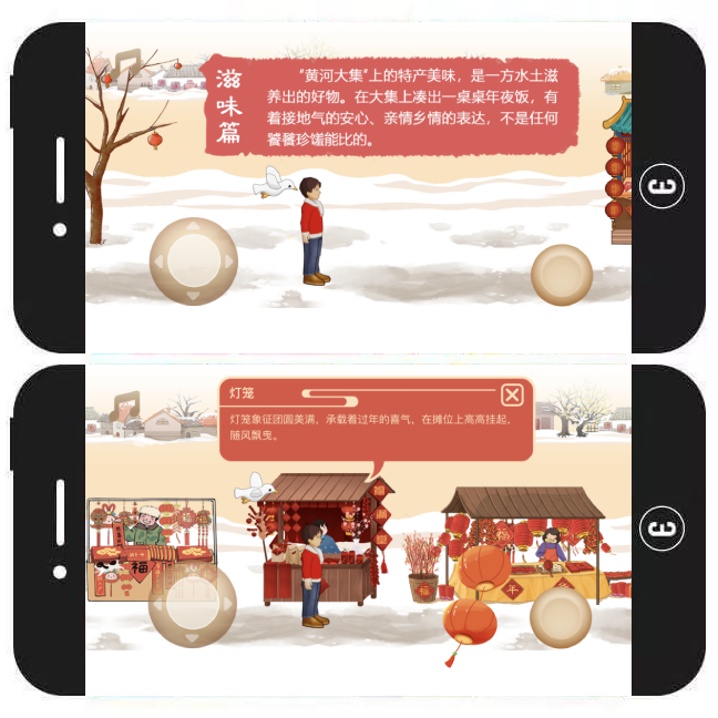 内容简介:这是一款趣味小游戏H5,作品主要以“虚拟摇杆”的方式给予用户不一样的互动体验。游戏场景呈现的是山东黄河大集,主要包括滋味篇、年味篇及特产篇,过年氛围感拉满~游戏前,用户可根据提示按钮进行相关设置(选择是否开启音乐/音效),并查看操作指南。游戏中,用户需通过推拉虚拟摇杆的方式控制人物行走,并查看相关介绍、收集年货。