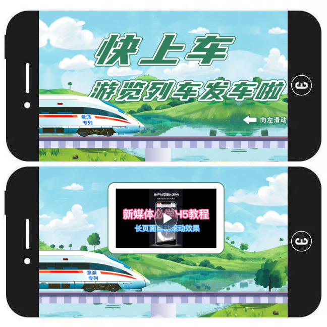 模板简介:该H5模板主要通过横屏长页面自动滚动效果,营造出一种列车一直在行进的场景,用户可通过滑屏操作查看各种图文、视频内容。