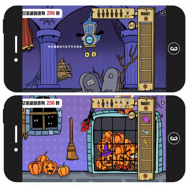 模板简介:这是一款万圣节沉浸式解密小游戏H5模板。用户可通过左右滑动长页面的方式观察古堡内的各种神秘场景,还可四处点击,从而获得一些具有助攻属性的提示或物品。游戏限时300s,若用户顺利找出了隐匿的6种魔法药水和钥匙,即可合成“集合药水”,从而将被变成南瓜的朋友们恢复原状并成功救出。