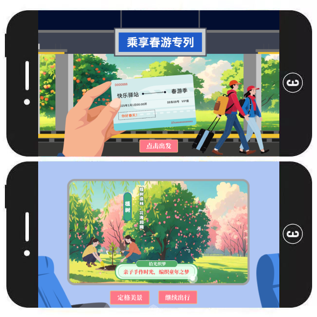 模板简介:用户可通过提示按钮触发各种动画效果,从而体验在线乘坐列车出游的感觉。当列车到达各个站点,用户还可根据提示跳转网址、生成海报。