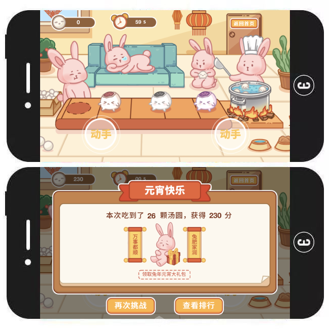 模板简介:这是一款吃汤圆小游戏H5模板。汤圆在传送带上运输,当到达指定范围内时,用户可通过“动手”按钮帮助兔子偷吃汤圆,汤圆的类型不同,得分也就不同。60s倒计时结束后,用户可查看游戏结果,并根据提示按钮再次挑战、查看排行榜或跳转网页领取礼包。