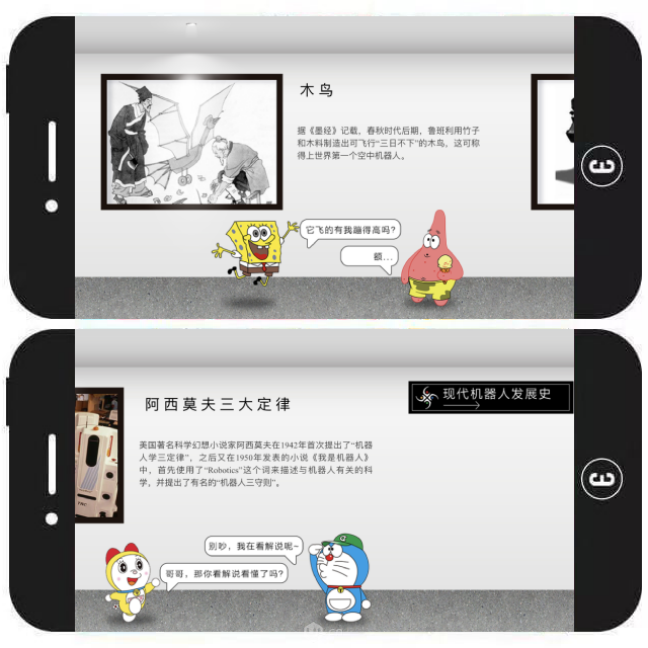 模板简介:用户可通过左右滑屏及点击操作在线观展(查看各种图文宣传内容),并浏览不同卡通角色的趣味对话。观展结束后,用户还可通过长按识别二维码的方式前往相应的公众号。