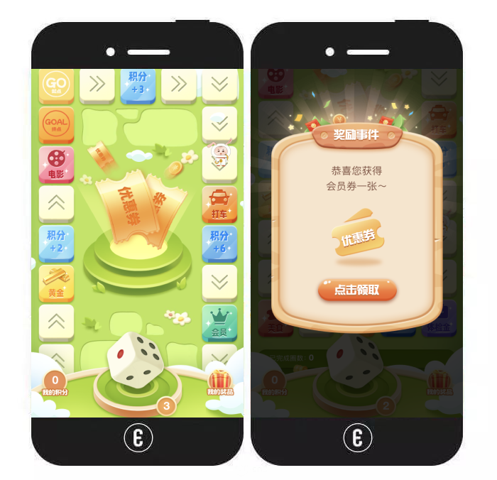 这样的趣味玩法同样可以简单化地运用到H5中。掷骰子的机制可以让游戏充满随机性,若同时加入积分、奖券等元素,则可让玩家在熟悉中找到新鲜感。