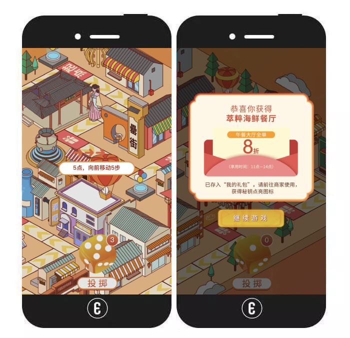内容简介:用户可先选择游戏角色,并填写联系方式,再开始游戏。游戏界面以2.5D插画地图的形式将包河6条特色美食街区融合在了一起,并加入了包河文化、特色美食街区建筑元素。游戏过程中,用户可通过投掷筛子的方式触发角色前进,并领取相应的消费券。待集齐10个消费券后,用户即可参与抽奖。此外,用户还可根据提示按钮进入“我的礼包”板块,并输入秘钥(若用户前往商场并使用消费券,即可从商家处获得“秘钥”)、点亮图标。点亮3个图标后,用户还可获得抽奖机会。