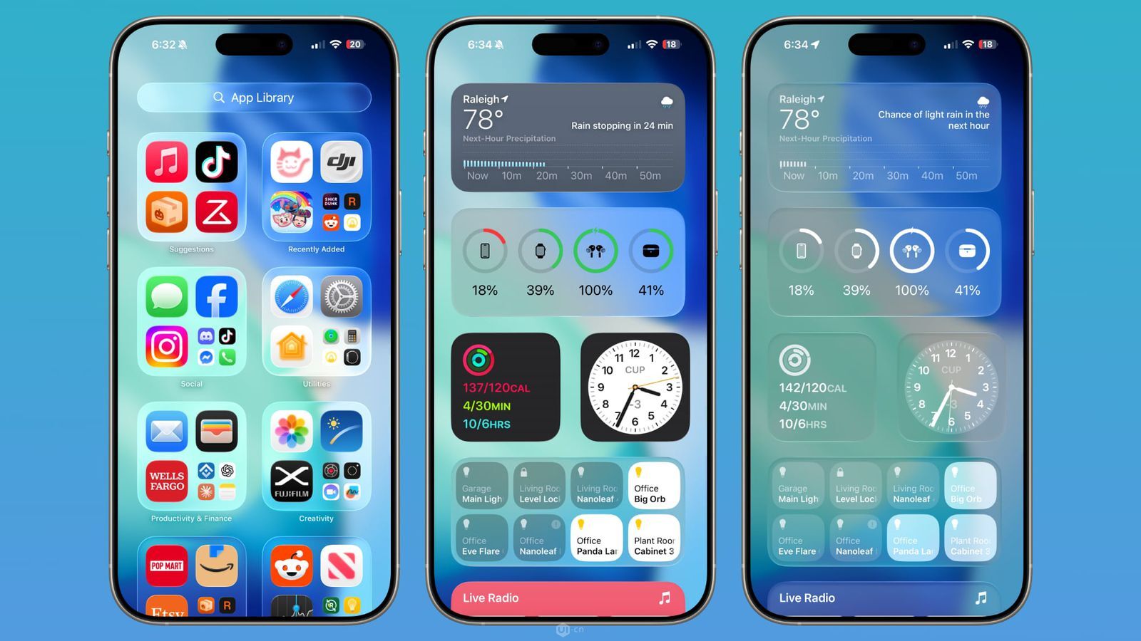 动态岛、通知中心、长按手势和应用程序库除了美观之外没有改变,应用程序库文件夹是半透明的,搜索栏是圆形的,对于小部件,根据您选择的图标颜色,会出现不同强度的玻璃外观。