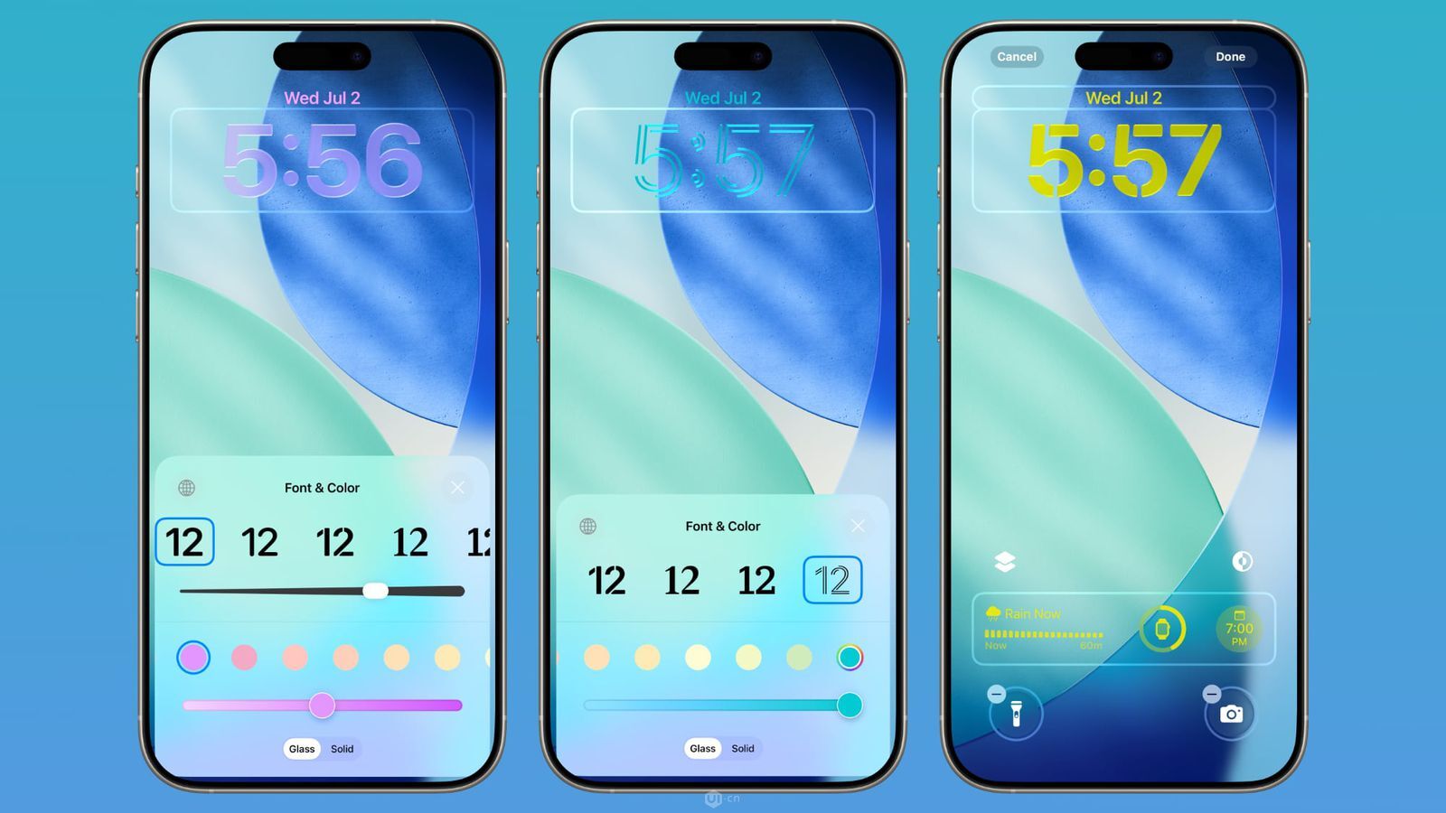 除了具有液态玻璃美感外,还可以调整时钟的大小,以更好地匹配您iPhone壁纸使用新的自适应功能,自定义锁定屏幕时,您可以抓住时间的一角并将其向下拖动以展开它。调整时间大小仅适用于第一个字体选项,并且仅适用于标准阿拉伯语、西方编号。
