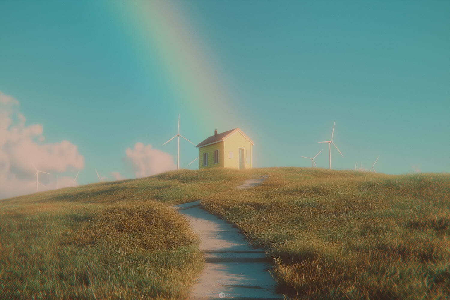 MJ 提示词: dreamcore aesthetic, a lone small pastel yellow house on a green grassy hill, a concrete path leading to the house, a clear blue sky with a faint rainbow near the clouds, a small strange white spherical object on the grass, soft and dreamlike lighting, slightly faded and muted colors, subtle surreal atmosphere, VHS tape texture,photorealistic --ar 3:2 --v 7.0 --style raw --profile 1pp1coq