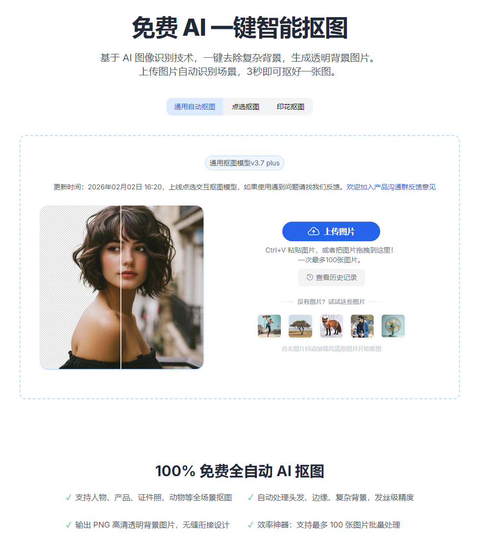 抠图核心优势:完全免费抠图、支持批量100张、发丝级精度