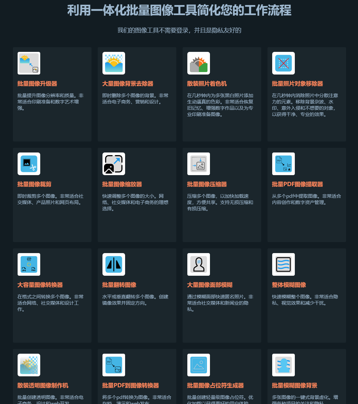 如果你需要的不仅是抠图,还希望在一个平台上完成批量放大、批量压缩、批量格式转换等操作,ImageToolsHub是不二之选。这是一款功能全面的国外在线工具包,特别强调用户隐私和批量效率。